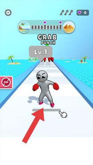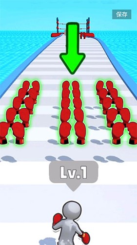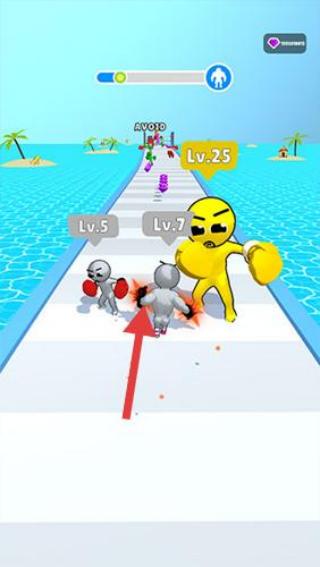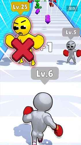 1、操控Lv.1拳击角色在跑道前进,收集资源升级。