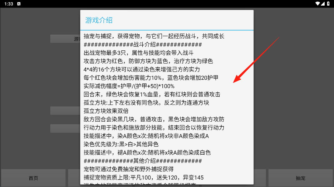 1、依据游戏介绍,捕捉宠物后,搭配最多3只出战,利用红、蓝、绿方块染色增强实力。
