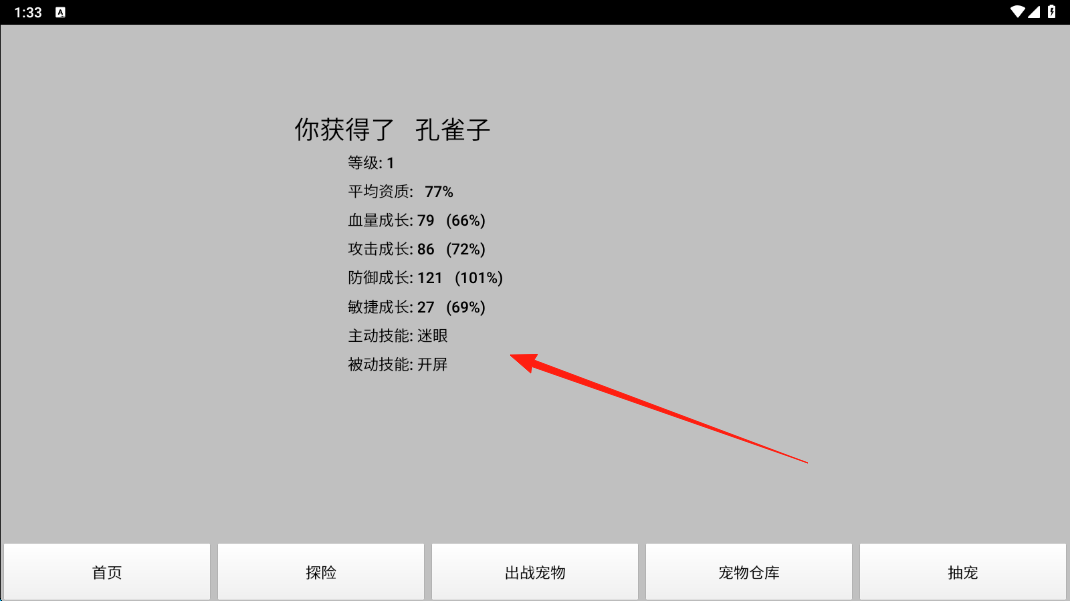 2、获得新宠物如孔雀子,查看其资质、技能,安排出战,借助迷眼等技能参与战斗。