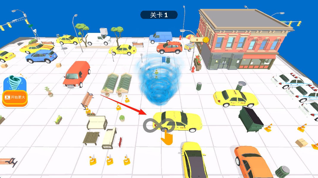 1、点击车辆,引导其进入漩涡,通过吞噬成长,注意规划路径,让车辆顺利被吸入。