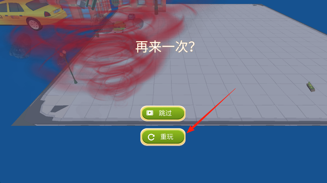 3、若挑战失败,点击“重玩”,重新引导车辆进漩涡,调整策略,再次尝试吞噬成长。