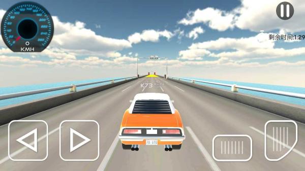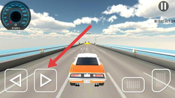 3、在跨海大桥赛道,点击左侧播放形加速按键,操控橙色赛车飞驰,紧盯剩余时间,全力完成竞速任务赢奖励。