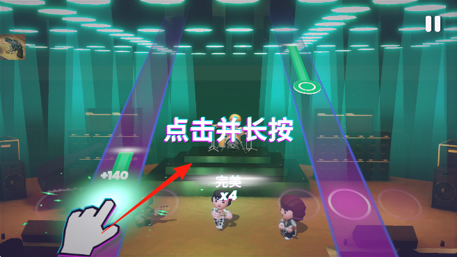 1、进入游戏首关选择主唱角色,伴随【WeWillRockYou】的鼓点节奏,在虚拟舞台上完成首次歌词哼唱对应的点击操作,开启摇滚冒险。