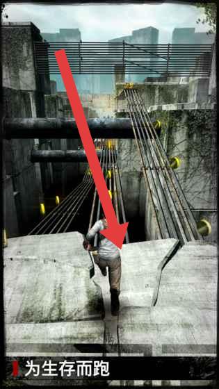 1、“为生存而跑”关卡,操控角色沿箭头方向,避开建筑障碍(管道、缺口),快速冲刺,利用场景(黄色标识)找路线。