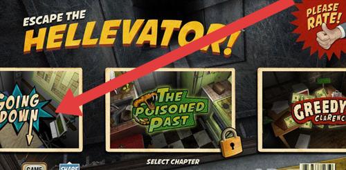 2、选“GOING DOWN”章节,进入电梯场景,留意“HELP!I’M FALLING!”提示,探索周围(如箭头指引处)找线索(密码锁、隐藏物品)。