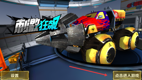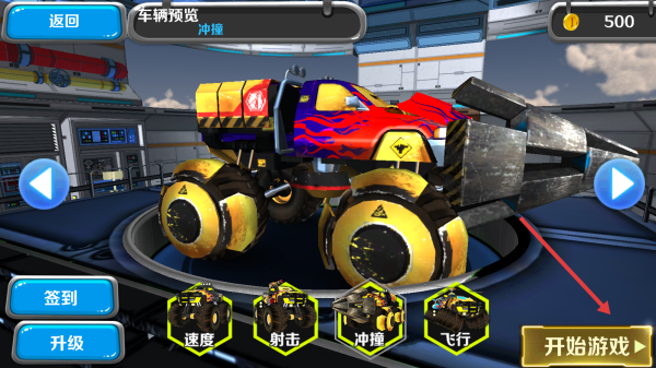 1、主界面点“点击进入游戏”,跳转车辆预览,选“冲撞”类改装车(可升级速度、射击等)。