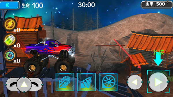 2、确认车辆后点“开始游戏”,进入荒野赛道,用虚拟按键(方向、技能)操控卡车。