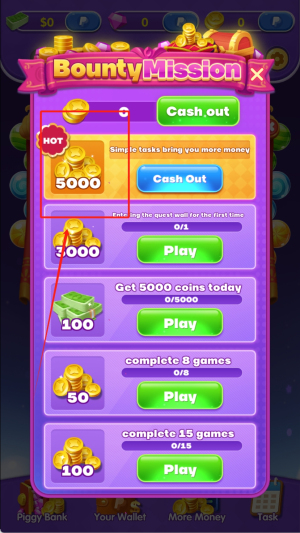 1、进入游戏后点击Bounty Mission查看任务列表,优先完成红框标注的5000金币热门任务,点击Play开始挑战积累奖励。
