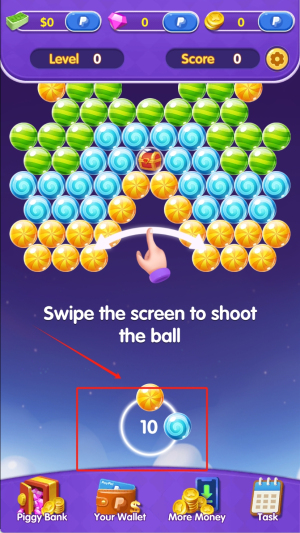 2、在消除游戏界面滑动屏幕发射彩球,瞄准与红框数字10同色的泡泡进行消除,连续命中可触发连击加分。
