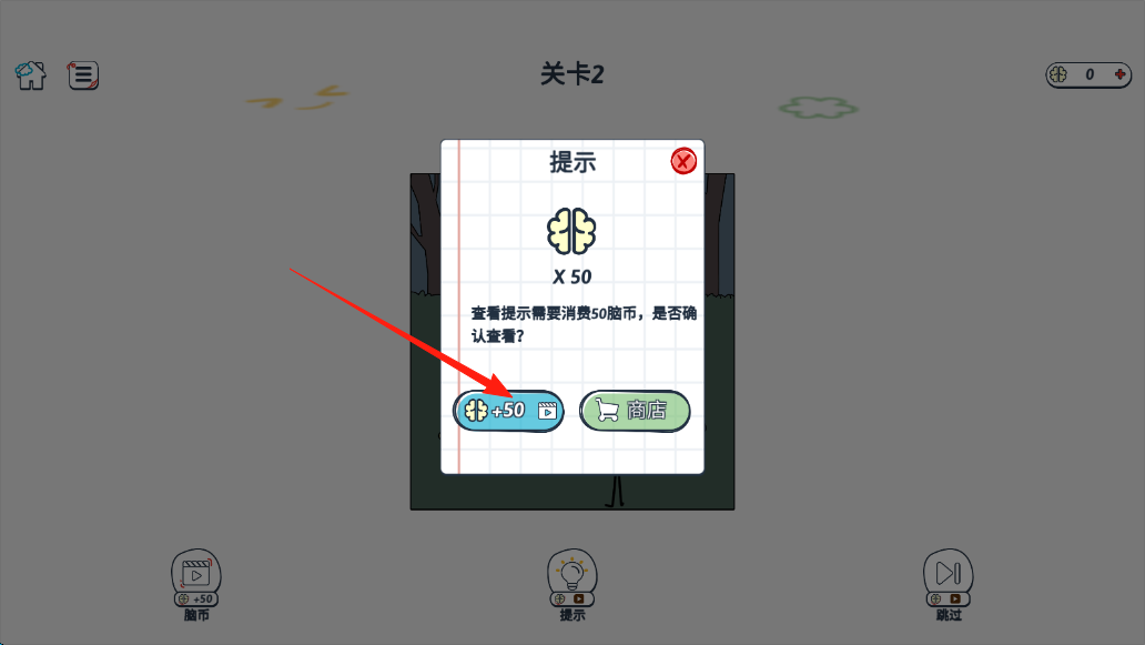 3.关卡2提示需50脑币,若脑币足够,点击花费脑币获取提示助力通关。
