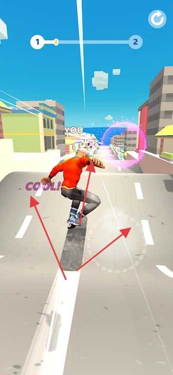 2、与其他滑板手同场竞技,沿道路滑行,比拼速度,超越对手,率先抵达终点。