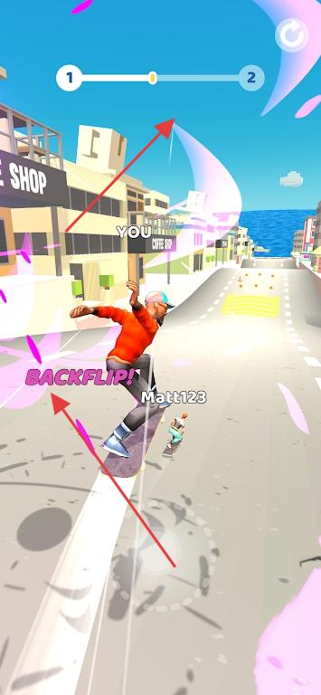 1、流畅滑板操控:通过简单直观的操作,实现滑板的加速、跳跃、旋转等动作,精准控制滑板姿态,完成高难度技巧组合。