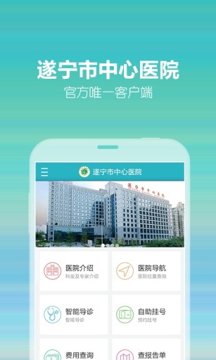 遂宁市中心医院唯一官方手机客户端全科室开放预约,顶尖专家面对面。提供预约挂号、排队叫号、查化验单、费用查询支付等强大功能,患者将免去排队困扰,享受更全面、更优质、更高效的医疗服务。遂宁市中心医院官方客户端是医院和恒生电子股份有限公司联合推出。
