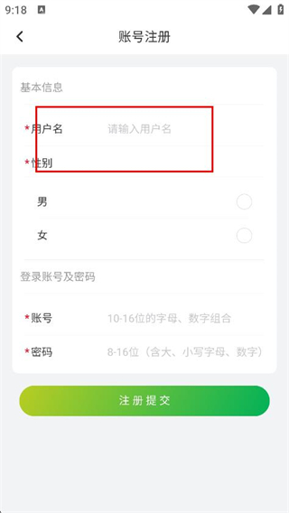 3、进入注册页面,在注册页面填写用户名以及选择性别。