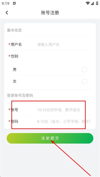 4、设置账号和密码,点击注册提交按钮,完成账号注册。