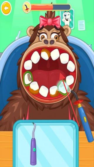 1、给猩猩看牙,用蓝色工具清理口腔杂物,再用紫色牙刷清洁牙齿,按提示操作,完成牙科治疗。