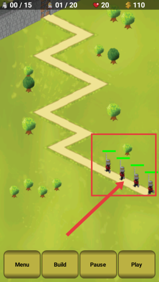 3、战斗时,在红框区域建防御塔,布置士兵,抵御敌人进攻,守护城堡。