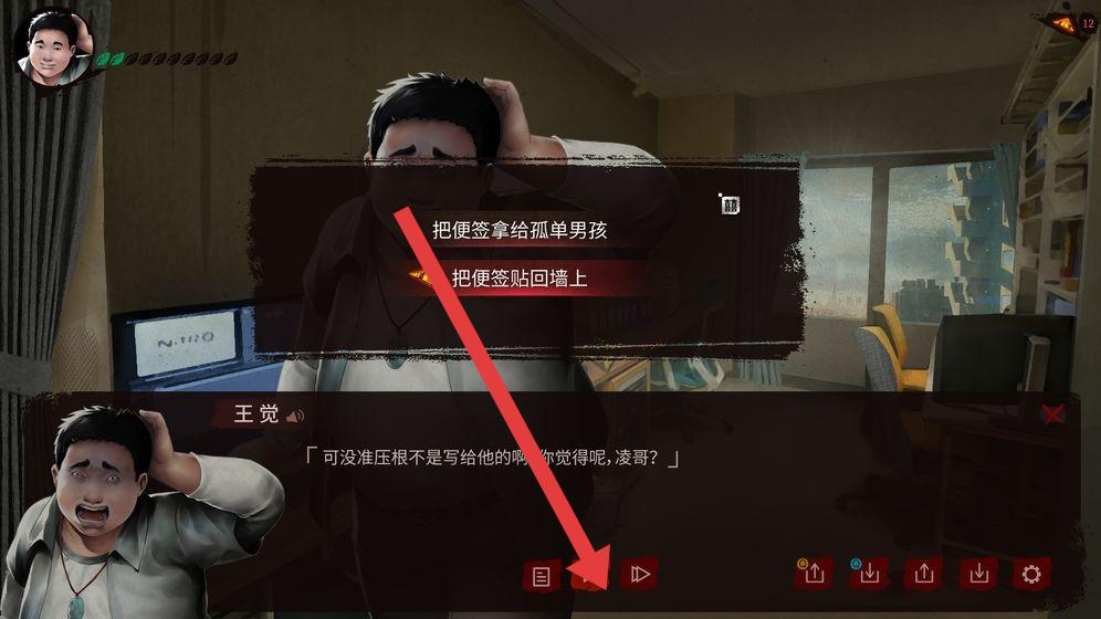2、对话时,根据选项(如“把便签贴回墙上”)选择操作,推进故事发展,注意对话分支影响剧情走向。