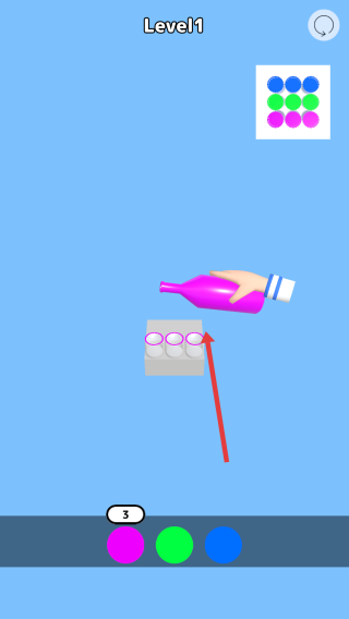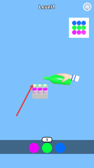 1、Level1界面中,点击底部粉色颜料,通过粉色瓶子向杯子倒入粉色液体。