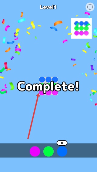 3、点击蓝色颜料,切换蓝色瓶子,倒入蓝色液体填充顶部区域,完成图案达成“Complete”。