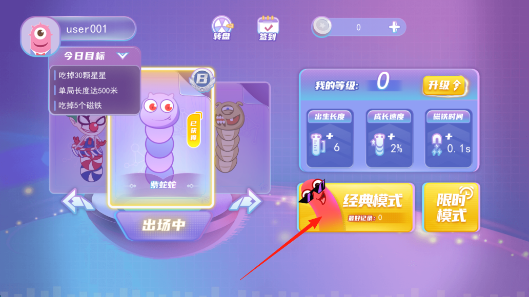 1、选“经典模式”,操控虫子在场景移动,吃星星磁铁,增长长度,完成目标。