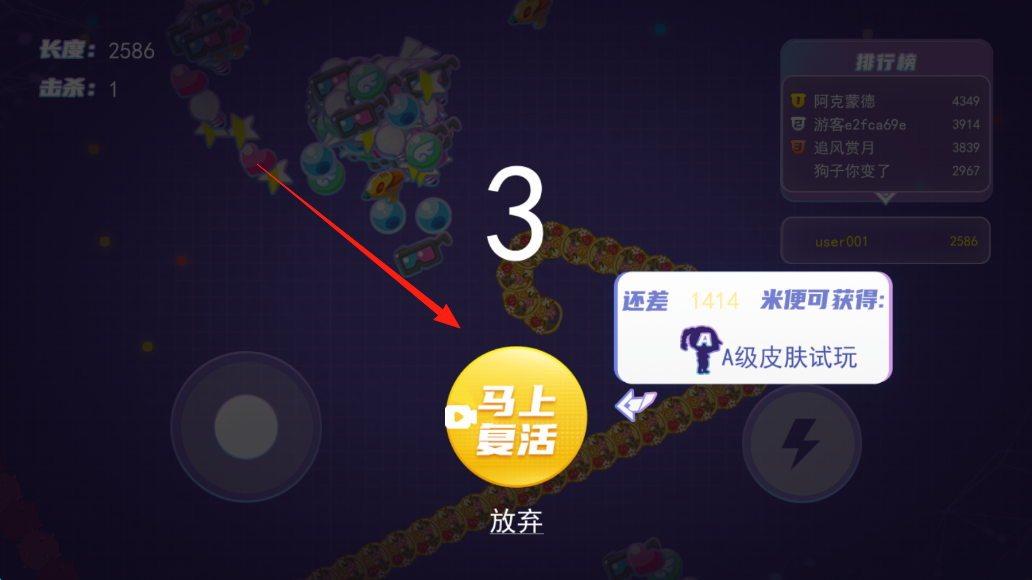 3、失败后可点“马上复活”继续,或“放弃”重开,积累长度,解锁皮肤。