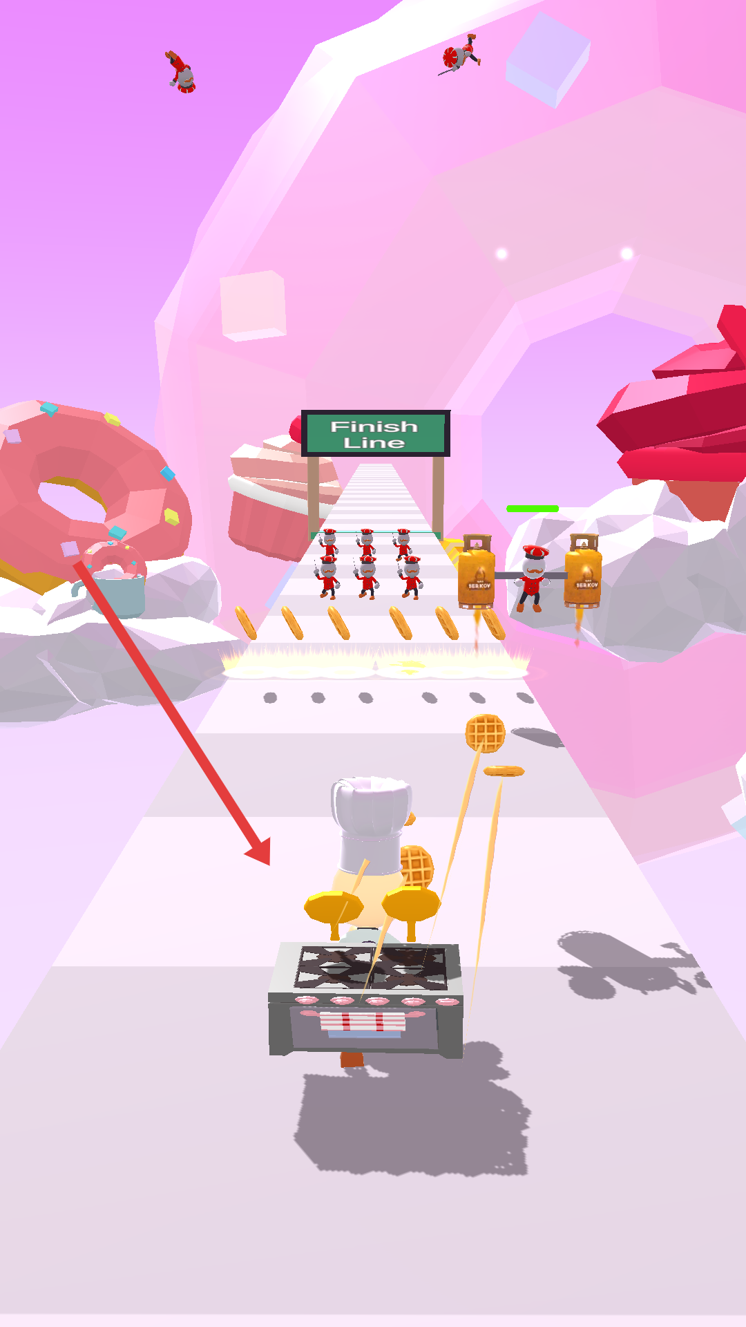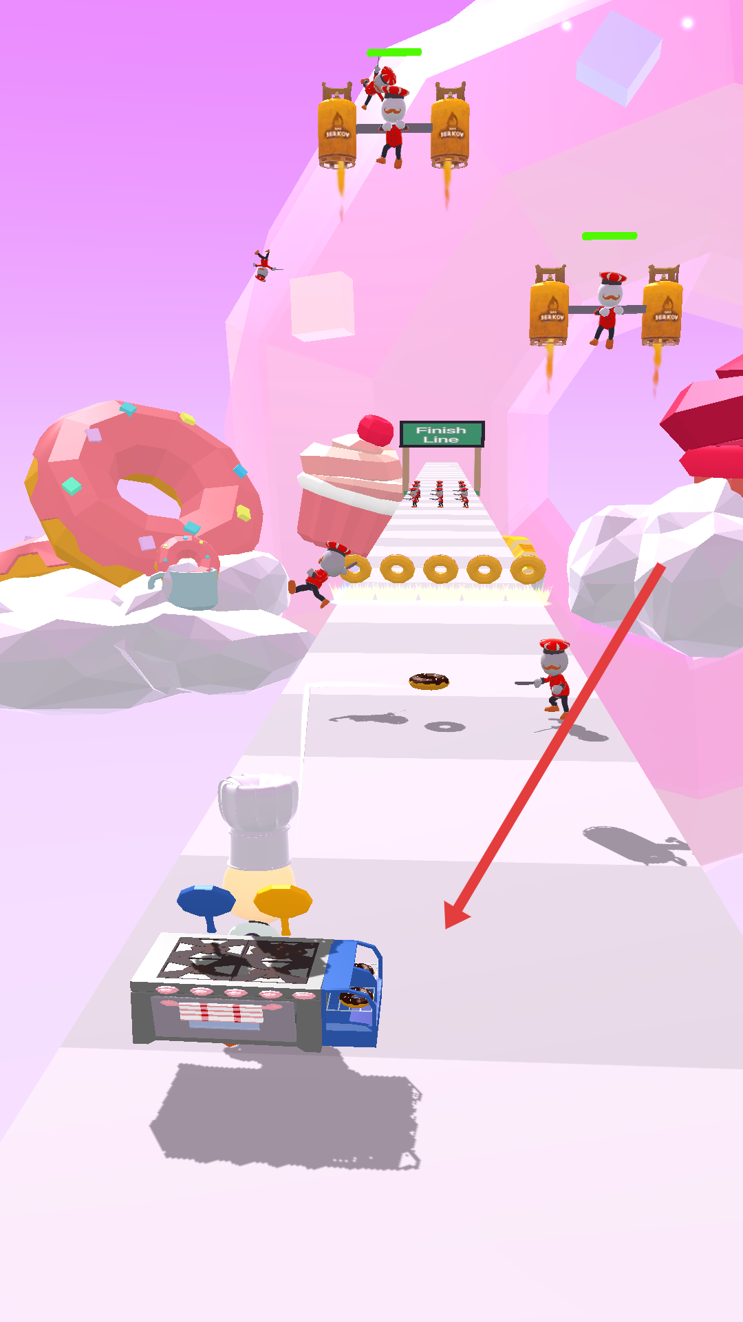 1、点击下方开始游戏,单手按住屏幕左右移动,厨师会自动发射食物清除前方敌人。