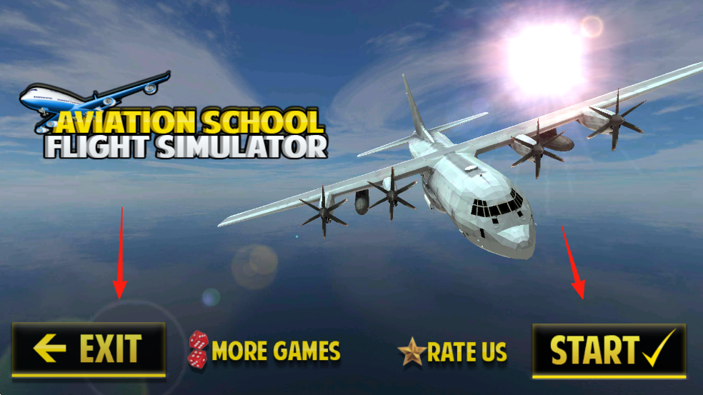 1、游戏启动界面,标题AVIATIONSCHOOLFLIGHTSIMULATOR,有EXIT(退出)RATEUS(给我们评分)START(开始)按钮。