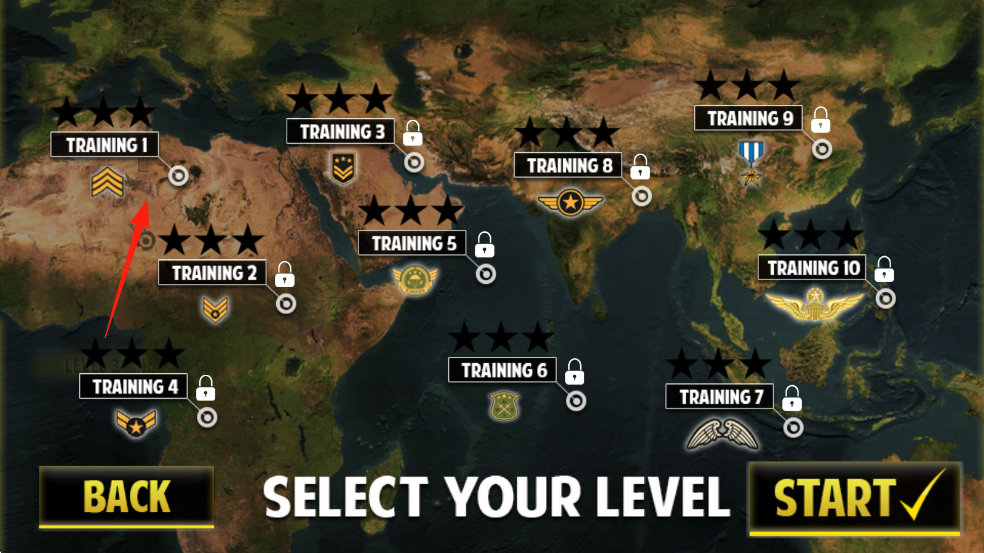 2、关卡选择界面,显示世界地图及多个训练关卡(TRAINING1-10),有BACK(返回)SELECTYOURLEVEL(选择关卡)START(开始)按钮。