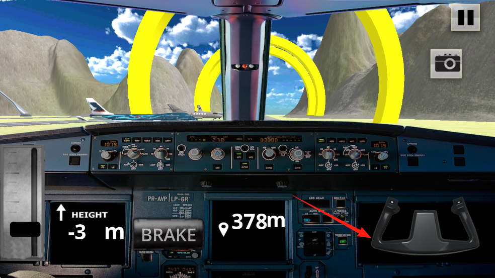 3、飞行驾驶舱界面,显示高度(HEIGHT-3m)、距离(378m)、刹车(BRAKE)等信息,红色箭头指向操纵杆。