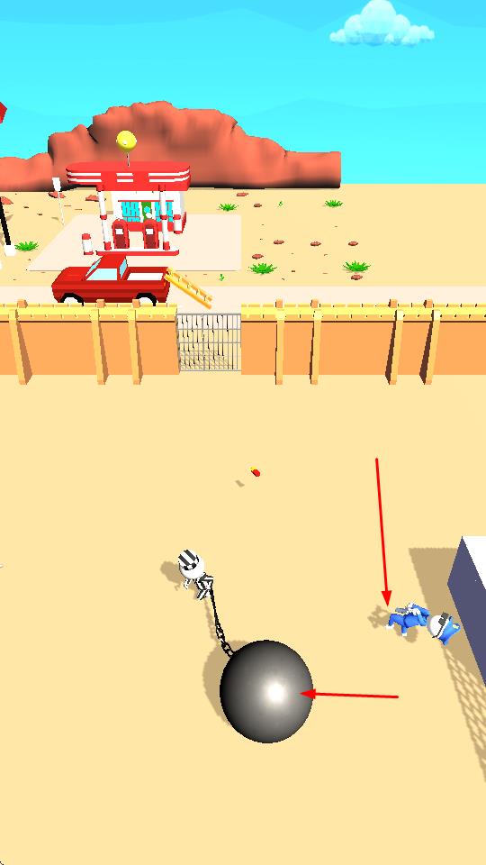1、控制戴枷锁的角色,拖拽巨型铁球,利用惯性、冲击力,撞击蓝色小人、围墙等目标,完成破坏。