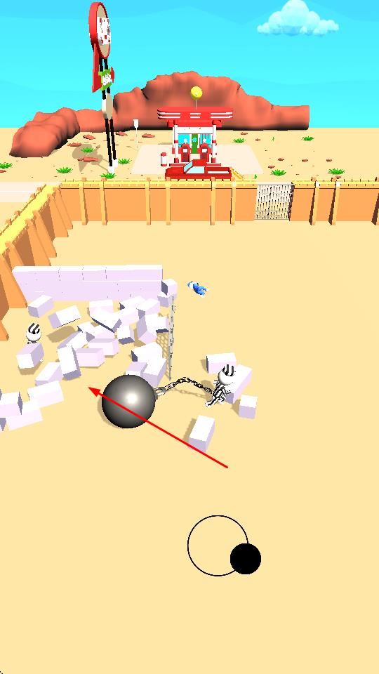 2、在沙漠场景中,用铁球破坏围墙、建筑,清除阻挡,推进路线,解锁新区域。