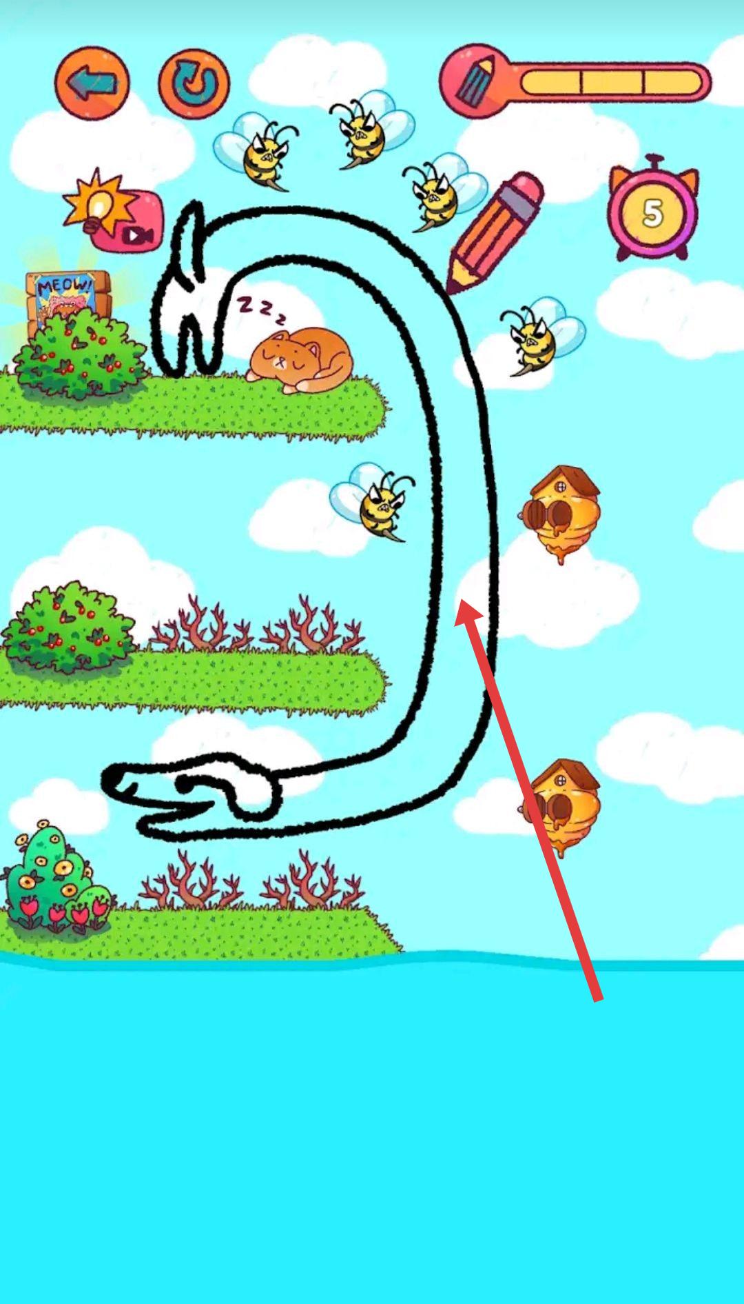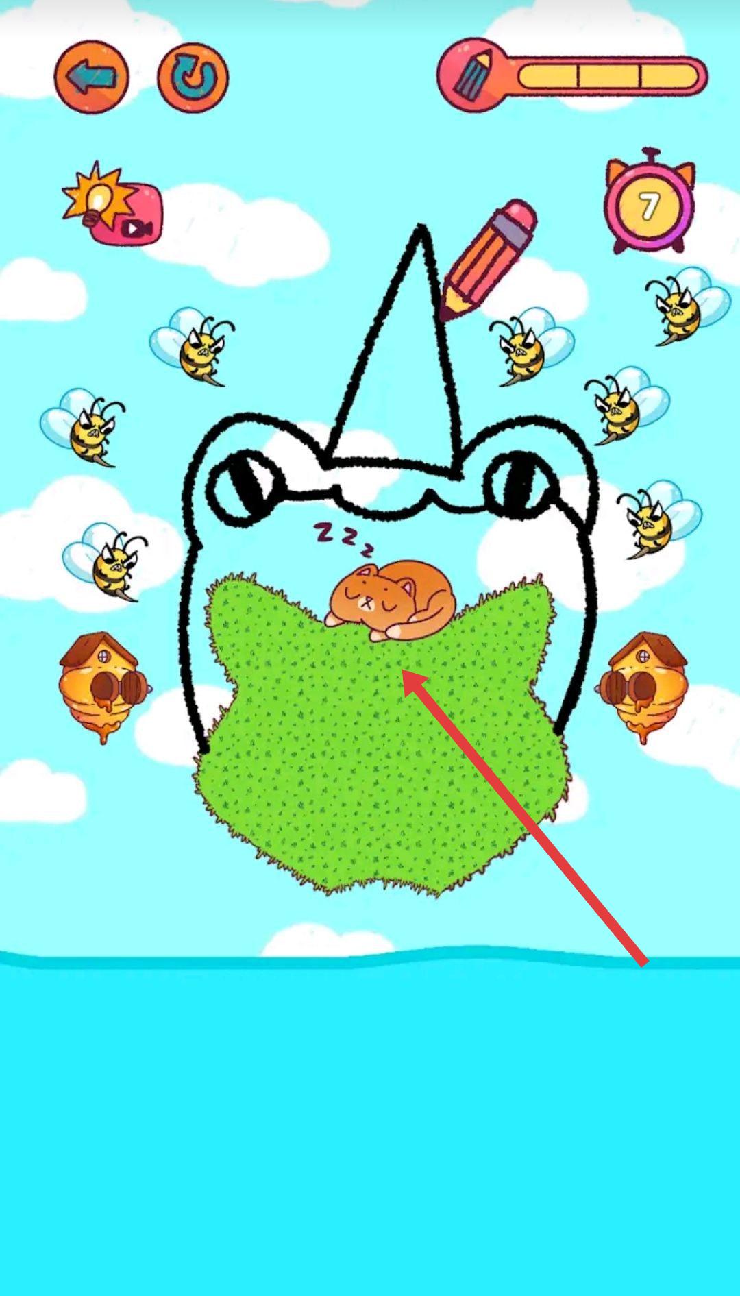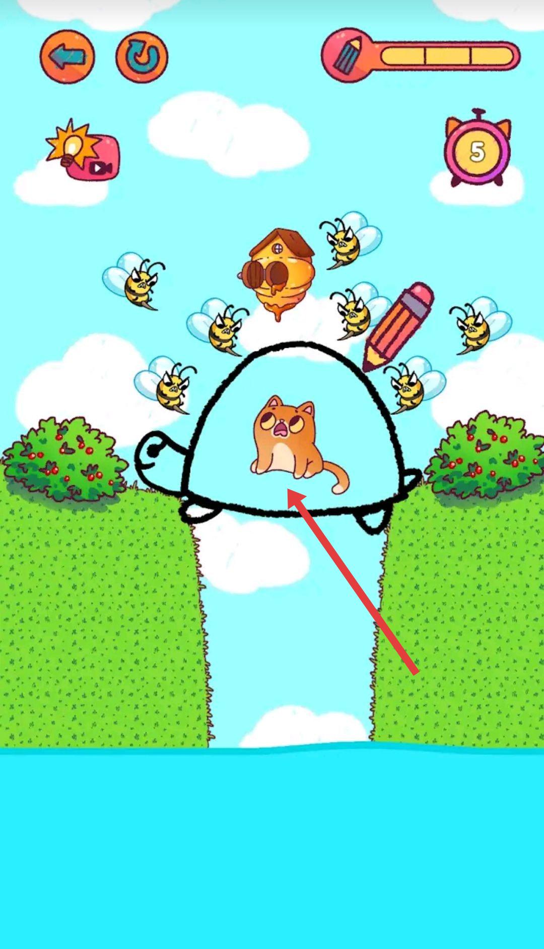 1、遇到猫咪需跨河且被蜜蜂围堵场景,用画笔绘【乌龟壳状屏障】,罩住猫咪,助其避蜂、过河。