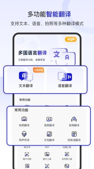 文本互译、语言翻译、拍照翻译等多种类型翻译功能。