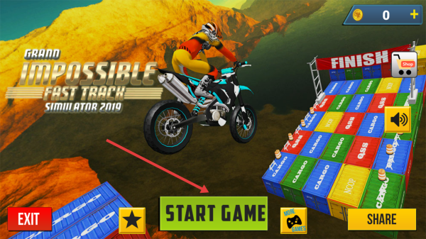 1、点击【STARTGAME】,操控骑手驾驶摩托,顺着箭头冲向由彩色集装箱构成的赛道,挑战特技竞速。