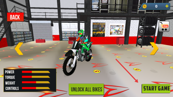 2、在车库界面查看摩托【POWER】【TORQUE】等属性,点击【STARTGAME】,驾驶摩托依照箭头指引准备赛事。