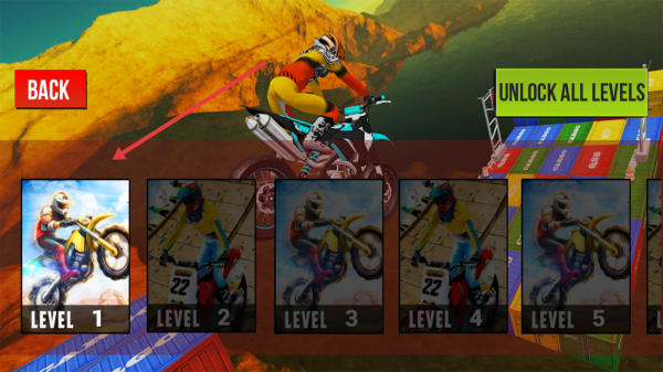 3、于关卡选择页点击【LEVEL1】,操控骑手与摩托,沿着箭头冲向赛道,开启首场特技越野挑战。