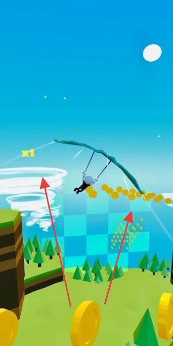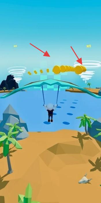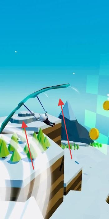 2、沿途有金币串,飞行中精准穿过,收集金币,积累资源,用于解锁道具、升级滑翔翼。