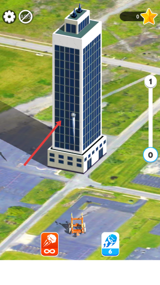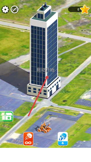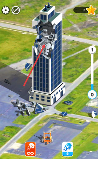 1、在高楼场景中拖动屏幕调整发射角度,向玻璃幕墙高楼发射橙色拆楼装置。