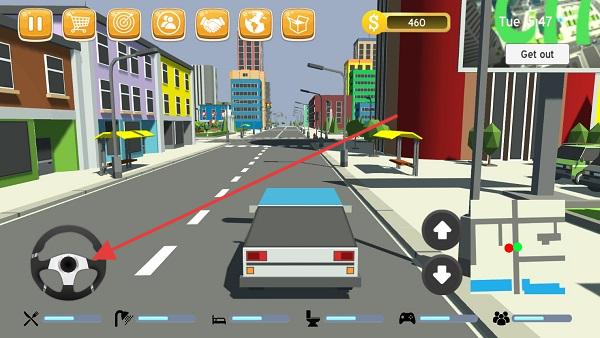 1、进入城市场景,用方向盘等虚拟按键操控汽车,在街道行驶、探索建筑与区域。