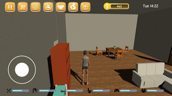 2、切换至室内场景,操控角色互动(如在房间移动、查看家具),体验生活内容。