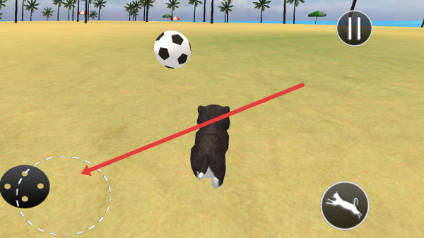 3、游戏中,操作左侧虚拟摇杆,控制宠物移动,在海滩追逐足球,完成特技或互动任务,体验玩法。
