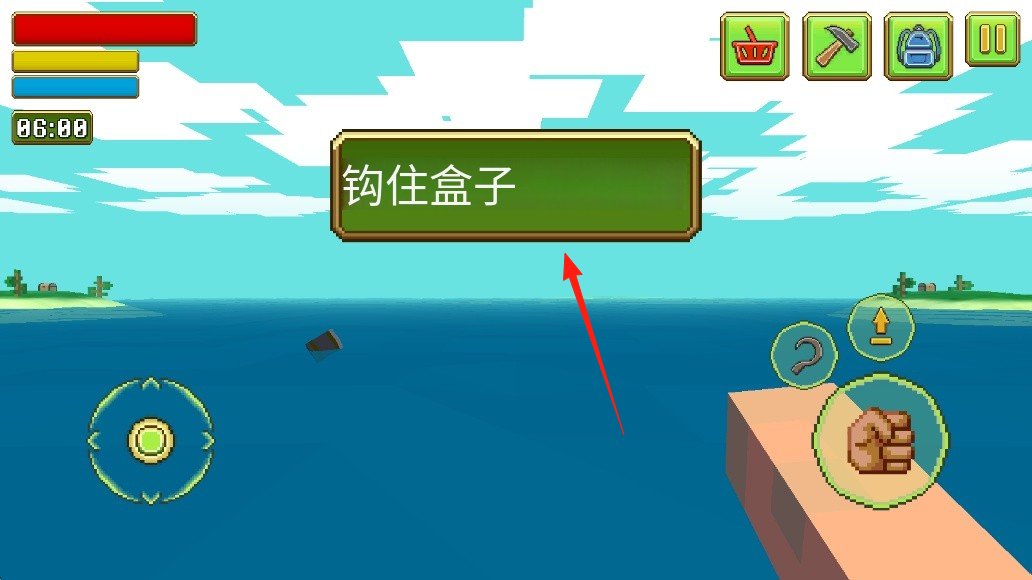 1、操控角色用钩子工具,瞄准海上盒子,点击释放钩子,将其钩住获取物品。