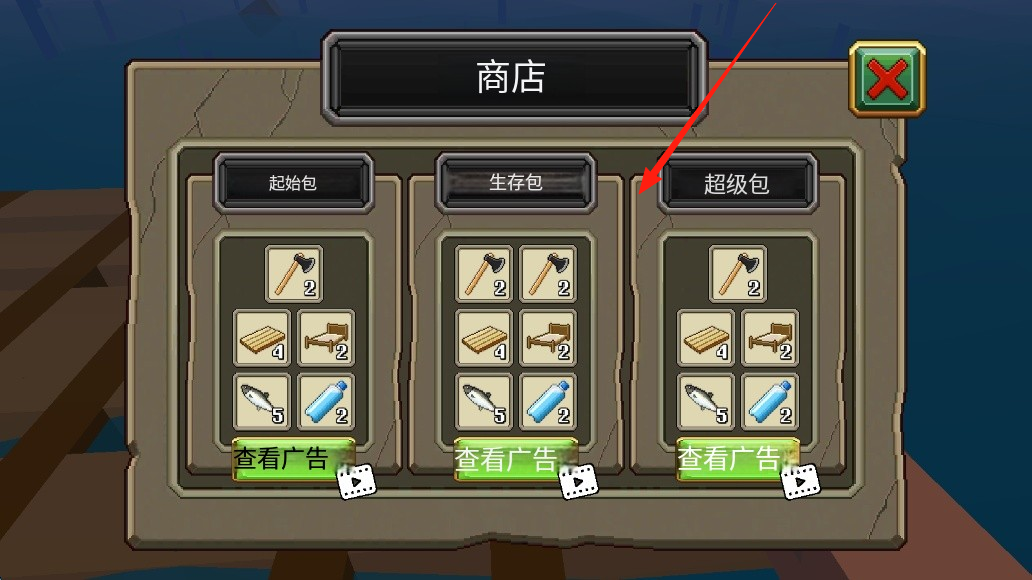3、打开商店,看广告解锁起始生存超级包,获取工具资源,助力冒险探索。