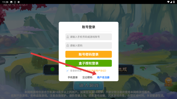2、在登录界面,点击【用户注册】,进入注册流程,可选择账号密码或盒子授权等登录方式。