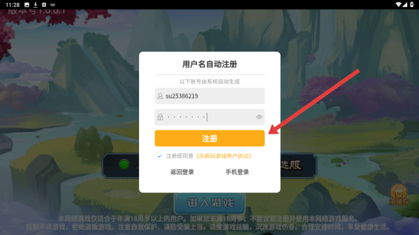 3、自动生成用户名后,点击【注册】按钮,完成账号创建,后续可登录进入游戏世界,开启旅程。