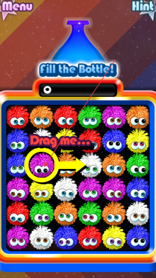 2、在关卡中,拖动彩色毛毛球,让至少三个同色相连,触发消除,填充上方瓶子。