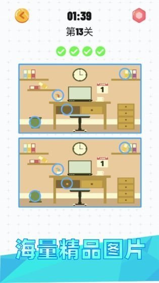 3、音乐相伴轻松解压:搭配欢乐背景音乐,缓解限时挑战的压力,营造轻松氛围,玩家可在愉悦的节奏中专注找茬,享受休闲与益智的双重体验。