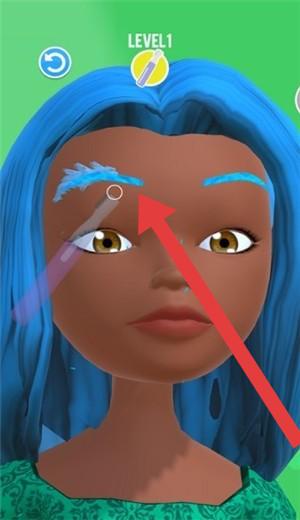 2、LEVEL1时,按箭头指引,用工具修整客户眉毛,调整形状、颜色,完成基础美妆步骤,提升美观度。