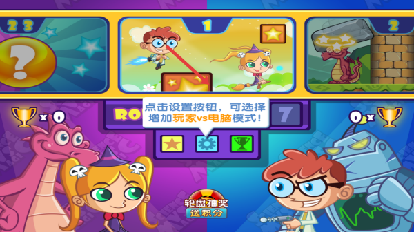 3、模式选择页,点“设置”开“玩家vs电脑”,匹配AI对战,善用“轮盘抽奖”攒积分,兑换道具(加速、障碍),提升闯关/对战胜率。